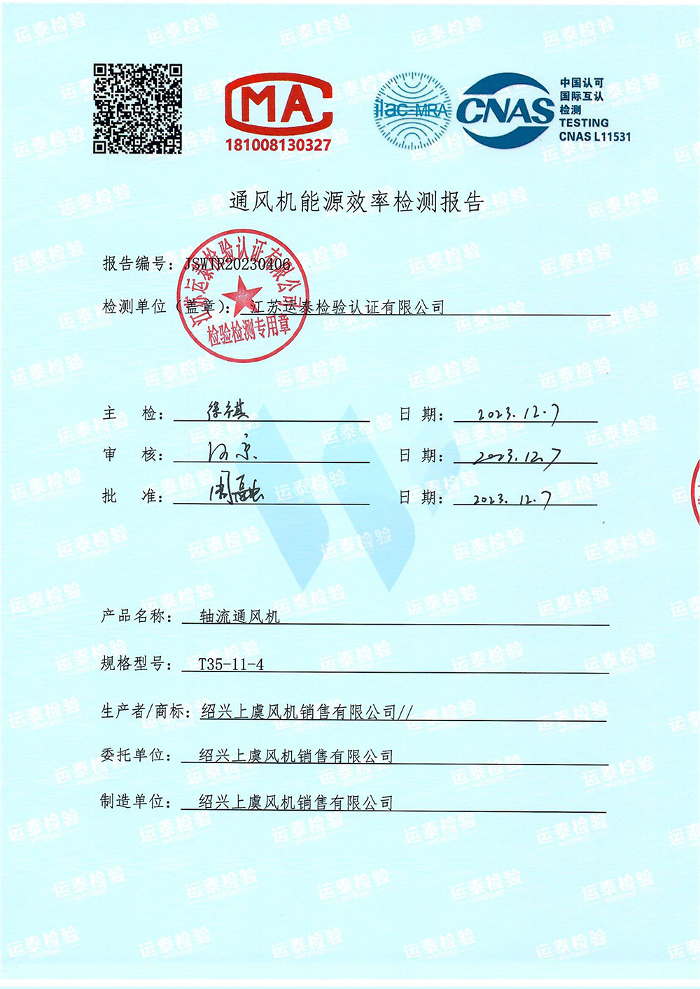 | 低噪聲軸流風機T35-11能效檢測報告 |